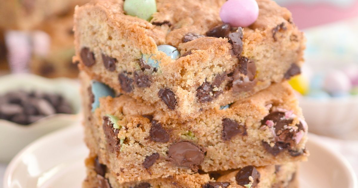 Receta rápida para hacer barras de galletas rellenas de trocitos de chocolate y M&M's.