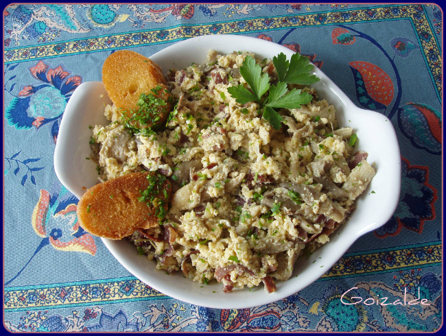 Esta receta es una variación del revuelto clásico, incorporando setas y jamón serrano. Se prepara a fuego lento para obtener un resultado jugoso y sabroso.
